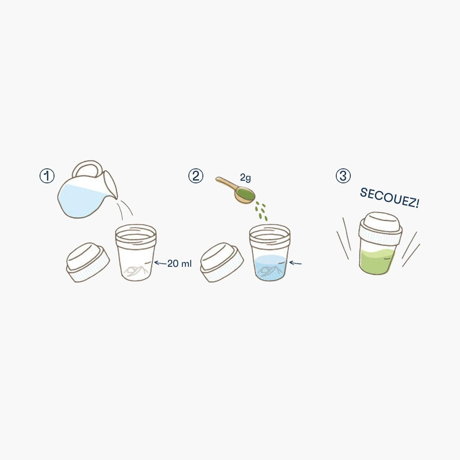 Fill the shaker supplied up to the mark (20 ml), then add a dose of matcha. Make sure the lid is tightly closed, then shake for about 15 seconds, until no lumps remain when viewed by light.