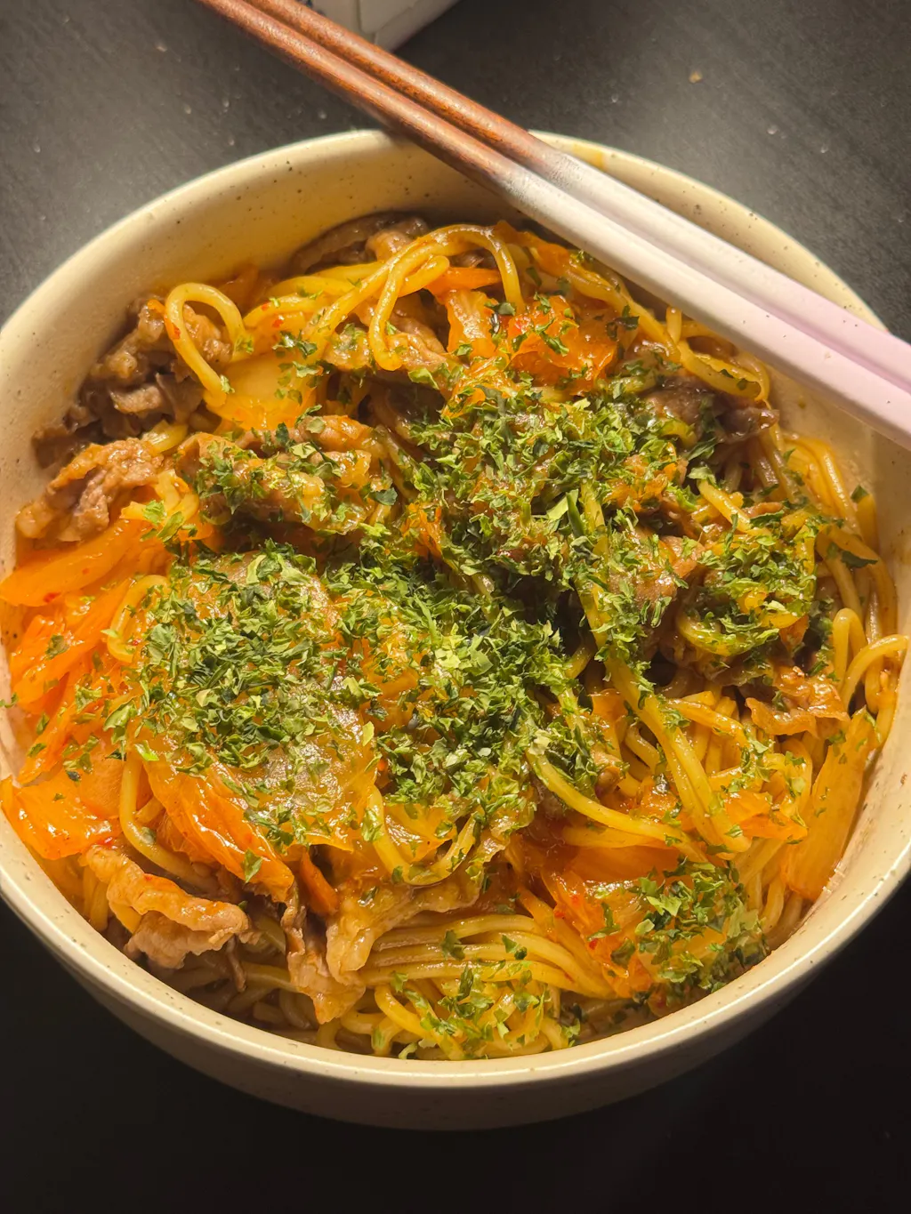 Pan-fry with a sauce (yakisoba, chuno, worcestershire, etc.), adding the vegetables of your choice.