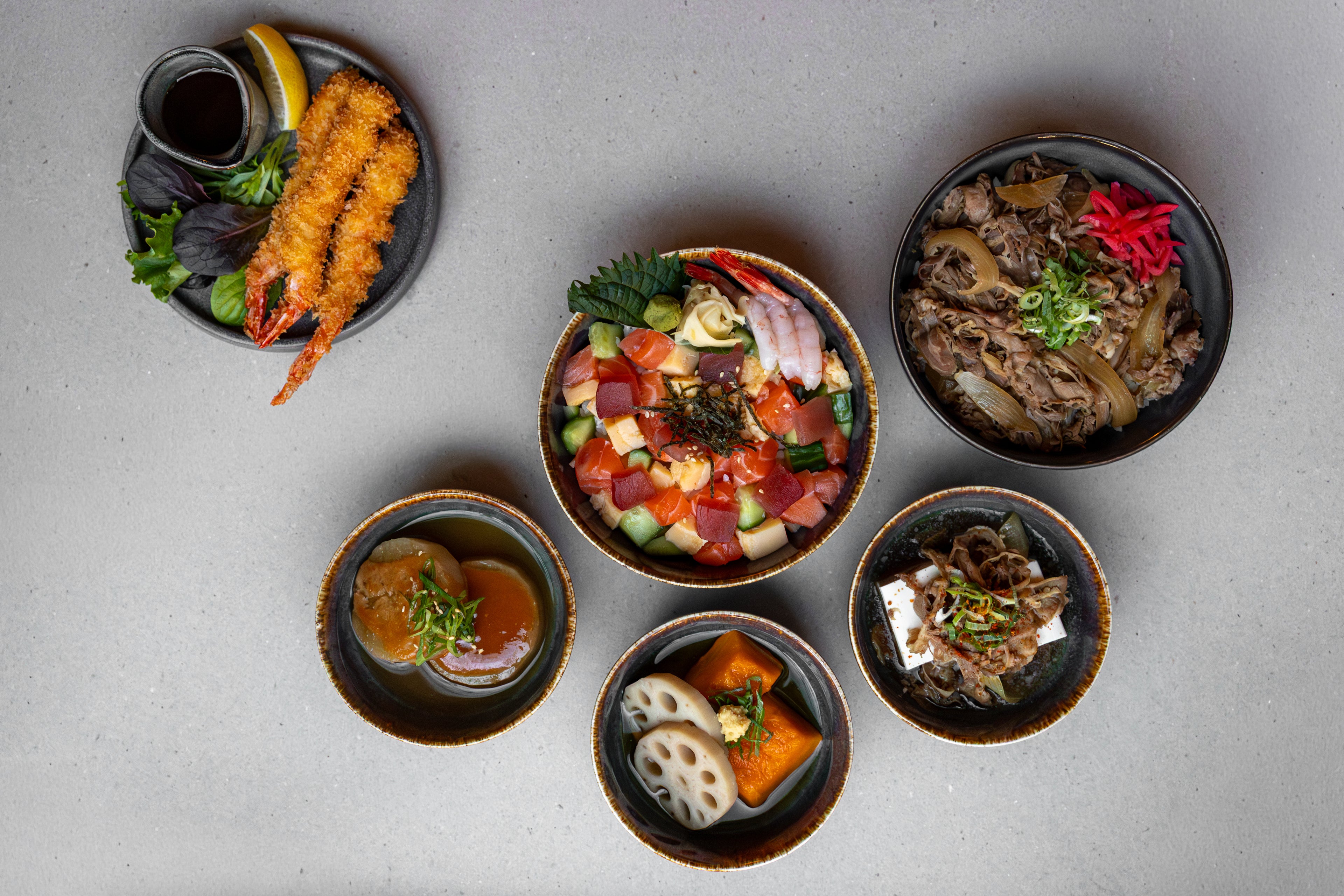 Servimos teishoku completos y personalizables: componga su comida con productos del mar, de la tierra u opciones vegetales, acompañados de arroz, sopa de miso y verduras. También ofrecemos otros platos tradicionales japoneses como karaage, tonkatsu o donburi de salmón.