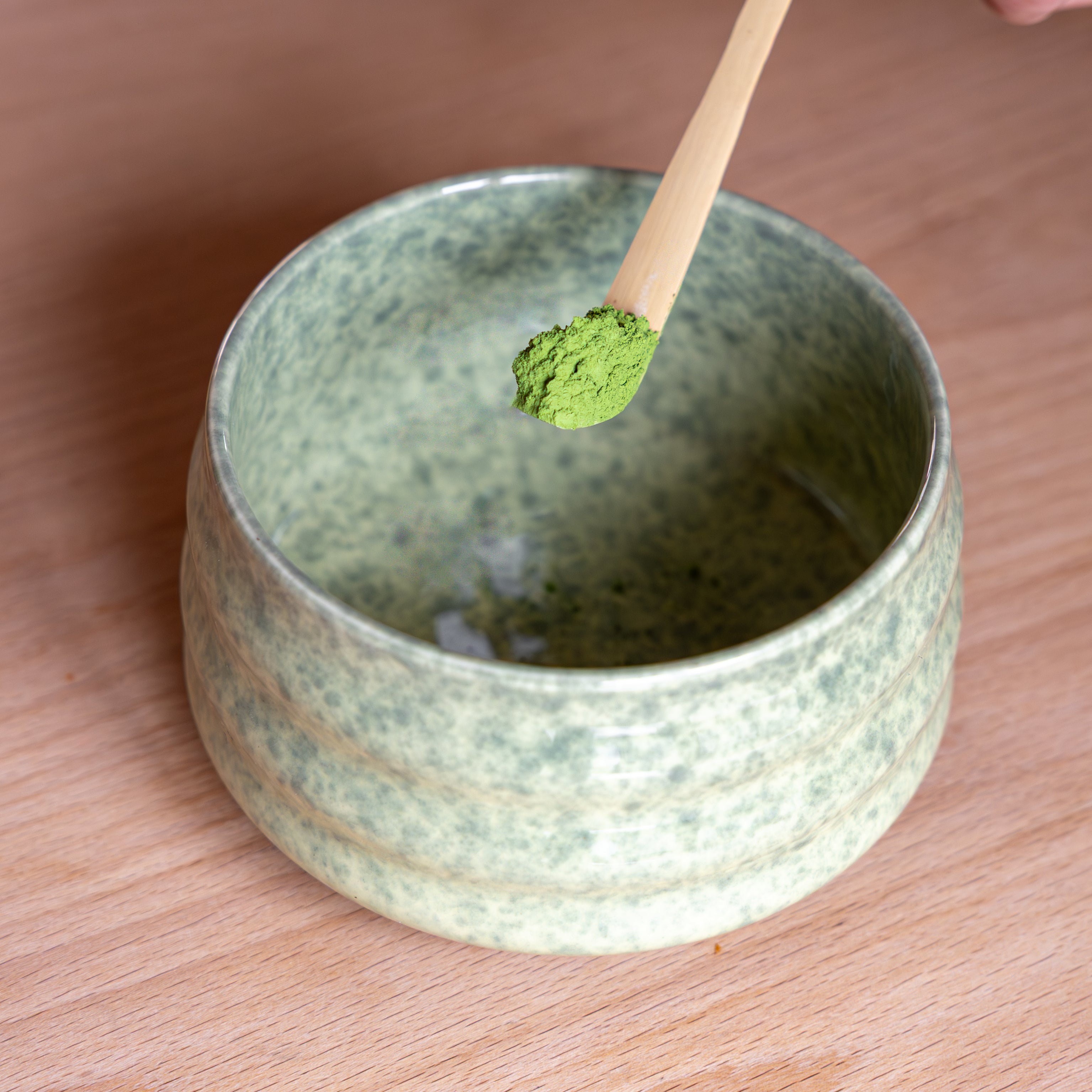 La base piatta o leggermente arrotondata della chawan permette di distribuire bene la polvere di matcha e l'acqua, rendendo la miscela più omogenea rispetto a una ciotola con i lati troppo dritti.
