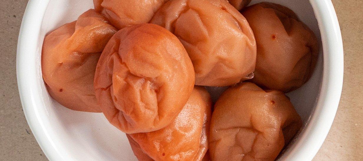 - Umeboshi (梅干し): Pruimen gefermenteerd in pekel met zout, soms met shiso voor een intens rode kleur. Ze staan bekend om hun zeer zure smaak en spijsverteringseigenschappen.